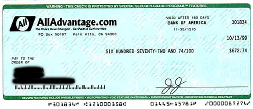 The average check paid to EACH member who surfed with the AllAdvantage ad banner on screen in August was $47.77 US! Many AllAdvantage.com members earned well over $1,000 US in one month! AllAdvantage.com is open to the US, Canada and now expanding to the UK. TELL YOUR FRIENDS!!